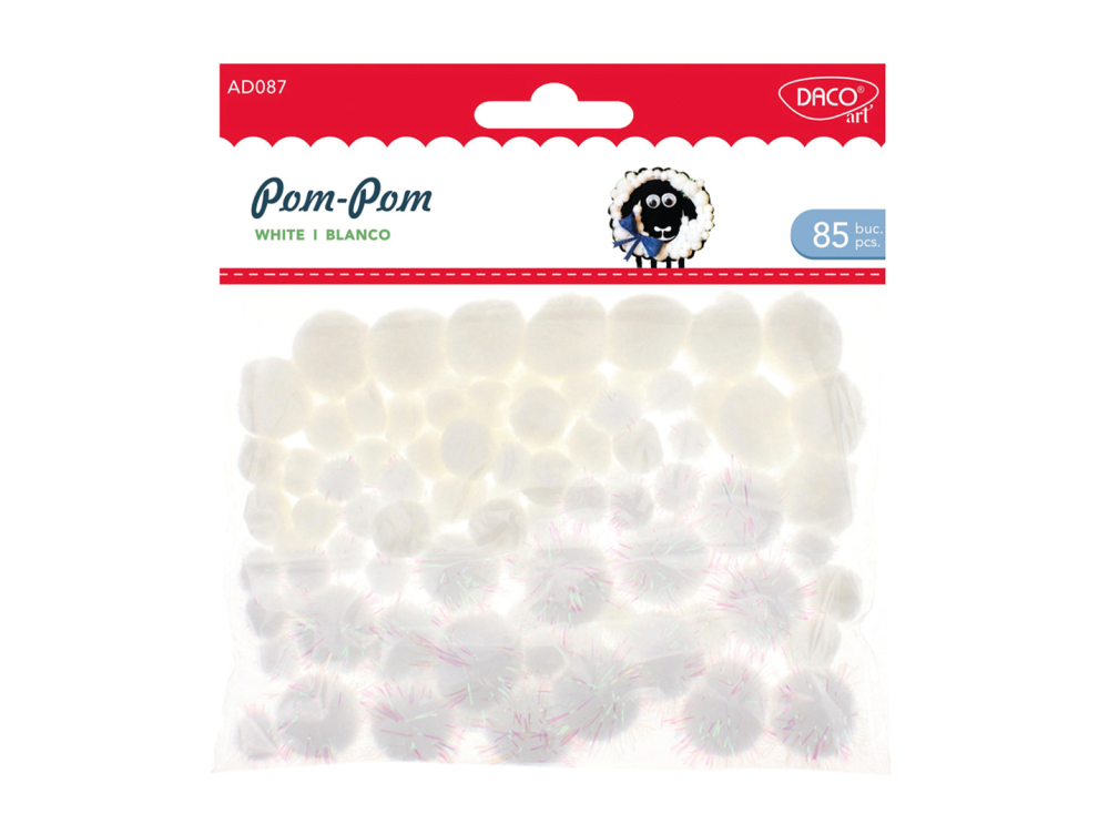 Setul de pom-pom-uri albe Daco conține 85 de bucăți ideale pentru proiecte creative. Oferă un aspect delicat și versatil. Perfecte pentru decorațiuni și activități craft variate.