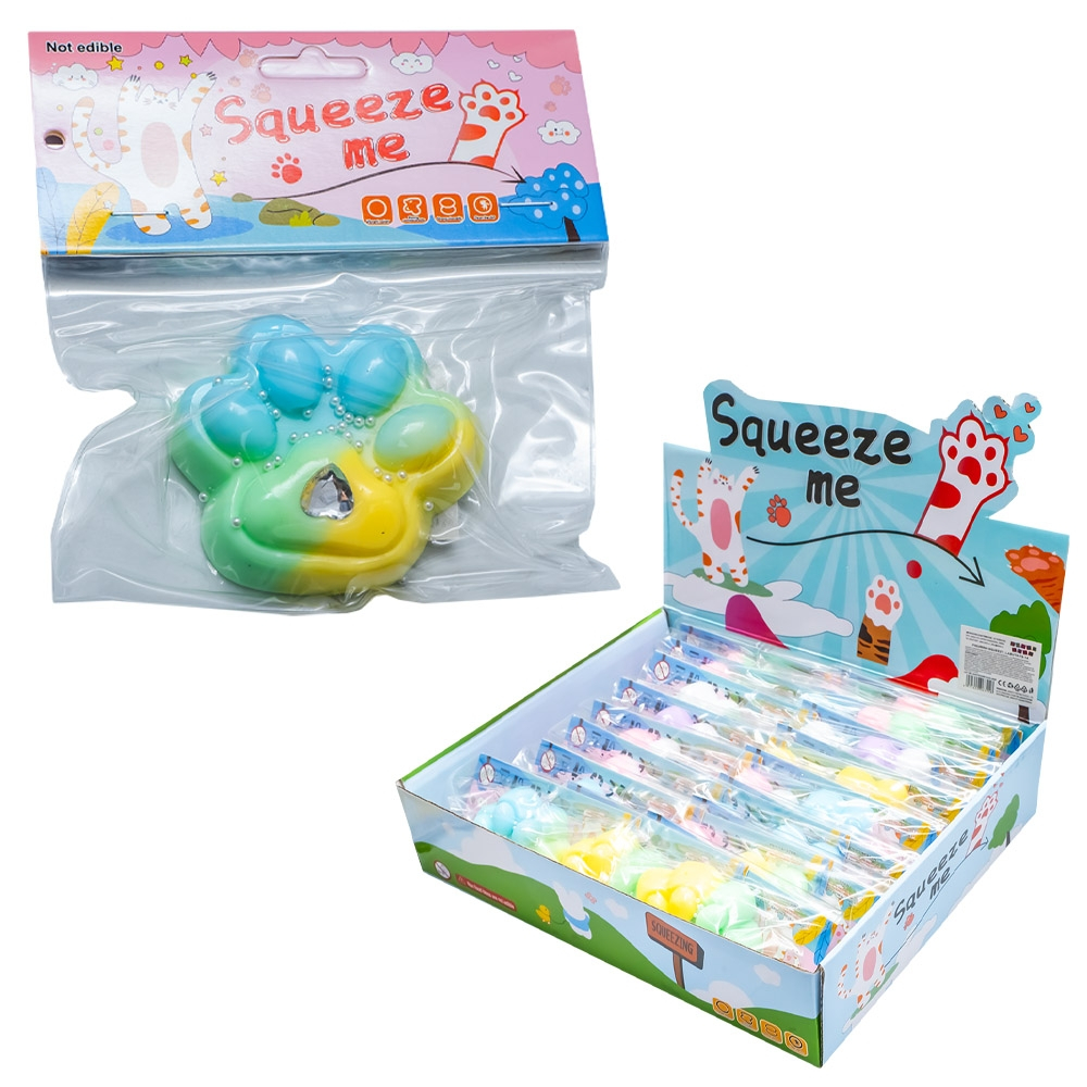 Bucură-te de joacă plină de culoare și relaxare cu figurina Squeezy Lăbuță multicoloră, o jucărie antistres realizată din material cauciucat lipicios, plăcut la atingere și ușor de strâns în palmă. Cu o greutate de aproximativ 55 g și dimensiuni de circa 6.5x6x2 cm, această lăbuță senzorială este decorată cu mici sfere albe sidefate și o inimioară din acril fațetat, care creează un efect vizual strălucitor la fiecare apăsare.