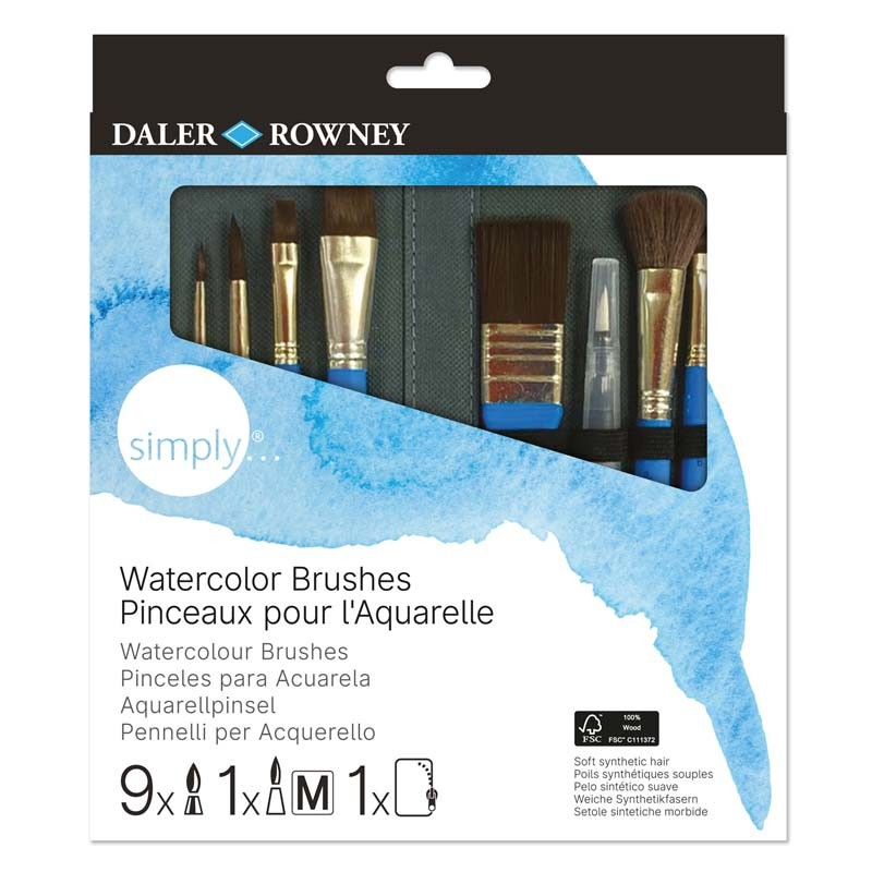 Trusa de 10 pensule Watercolor Simply Daler Rowney este special concepută pentru pictura în acuarelă. Oferă pensule moi, cu bună absorbție a apei și pigmentului. Este ideală pentru studiu, exercițiu și creație artistică.