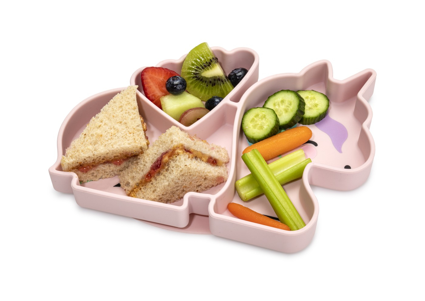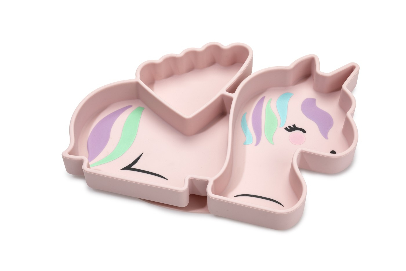 Farfurie compartimentata din silicon cu ventuza, Melii, unicorn Sa recunoastem, a hrani copiii mici nu este pentru cei slabi de inima, este o treaba care implica multa MURDaRIE! Adorabilele noastre farfurii din silicon, cu ventuza, au scopul de a face ora mesei mai putin stresanta si mult mai distractiva! Asezati farfuria compartimentata din silicon cu ventuza, Melii, unicorn pe o suprafata plana si lasati ventuza sa faca magia - farfuria Melii unicorn se va lipi de scaunul de hranire sau direct de masa si va puteti linisti stiind ca micutul dumneavostra nu va arunca sau tranti farfuria pe podea. Compartimentele ajuta la mentinerea alimentelor separate si ii ajuta pe copii sa-si serveasca singuri mancarea indeamnandu-I la o masa echilibrata. CARACTERISTICI PRODUS Se fixeaza cu ventuza pe majoritatea suprafetelor si se potriveste cu majoritatea scaunelor de masa. Designul distractiv cu personaje care incurajeaza hranirea independenta si creeaza o asociere pozitiva cu ora mesei. Compartimente care mentin alimentele separate si care ajuta copiii sa-si serveasca mancarea independent. 100% silicon alimentar de calitate Usor de curatat in masina de spalat vase pe raftul superior Sigur pentru utilizarea in cuptor, sau cuptorul cu microunde Fara BPA, plumb, PVC, cadmiu, ftalati Varsta recomandata: 6 luni +