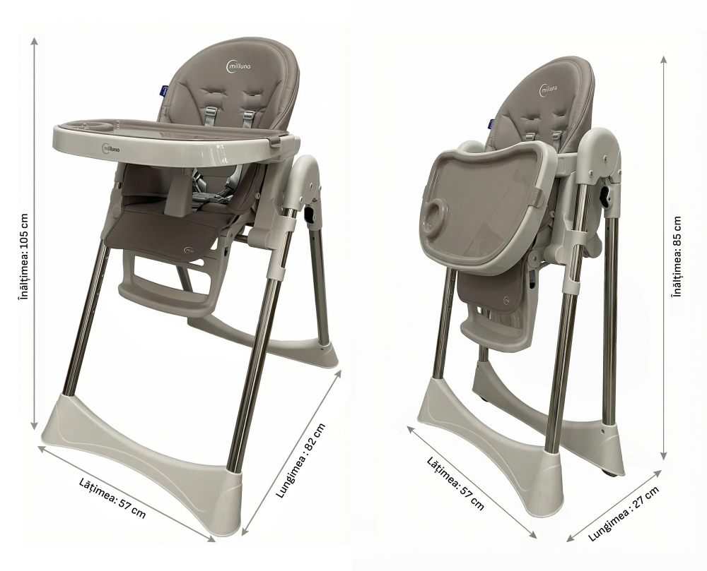 Miiluna Andromeda Grey – locul sigur si confortabil unde fiecare moment devine special Imaginati-va cum micutul vostru zambeste in timp ce il asezati in scaun – relaxat, confortabil, protejat. Miiluna Andromeda Grey nu este doar un scaun de masa, ci locul unde primele gusturi, primele rasete si primele descoperiri devin memorii de neuitat. Spatar reglabil pana la 145° Fie ca micutul vrea sa stea drept la masa sau sa se relaxeze dupa o gustare, spatarul reglabil ii ofera sustinere perfecta. Este ca un mic brat care il tine confortabil, protejat si fericit, fie ca se joaca sau doarme o clipa. Suport de picioare ajustabil in 3 pozitii Copiii cresc rapid, iar Miiluna Andromeda Grey creste impreuna cu el. Suportul de picioare il ajuta sa stea corect si relaxat, sprijinindu-i micile membre intr-un mod natural si ergonomic. Reglare inaltime pe 7 pozitii Indiferent daca este un mic explorator sau abia incepe sa invete sa stea la masa, scaunul se ajusteaza usor pentru a fi la inaltimea perfecta. Tu vei avea tot timpul acces la el fara sa te apleci prea mult, iar el se simte implicat si in siguranta. Husa din PU ecologic, usor de curatat Zambete, gusturi noi, pete… toate fac parte din copilarie! Dar curatarea nu trebuie sa fie o povara. Materialul ecologic al husei se curata rapid si usor, pastrand scaunul proaspat si igienic pentru fiecare moment petrecut impreuna. Masa principala si tavita secundara Fiecare masa sau moment de joaca poate fi adaptat instant. Tavita secundara se inlocuieste rapid, astfel incat sa treci usor de la hranire la joc. Asa, copilul tau exploreaza, gusta si invata fara intreruperi, iar tu te bucuri de fiecare zambet. Rotite pentru transport facil Vrei sa muti scaunul din bucatarie in living sau in camera de joaca? Cu rotitele integrate, mutarea este rapida si fara efort, iar copilul ramane mereu in centrul atentiei tale. Pliabil si usor de depozitat Cand spatiul e limitat, fiecare centimetru conteaza. Miiluna Andromeda Grey se pliaza simplu si ocupa foarte putin loc, astfel incat sa ai mai mult spatiu pentru joaca, pentru tine sau pentru momentele in care vrei sa pastrezi ordinea. Culori moderne si elegante Pe langa functionalitate, scaunul aduce un strop de stil in casa ta. Culorile sale moderne se potrivesc armonios in orice interior, integrandu-se natural si aducand o nota de prospetime si veselie. Stabilitate si siguranta Cu sistemul de amortizare profesionist si centura de siguranta in 5 puncte, copilul tau este protejat in orice moment imprevizibil. Tu te bucuri linistita, iar el se simte liber sa exploreze, sa invete si sa rada. Caracteristici tehnice complete: Spatar reglabil pana la 145° Suport de picioare reglabil in 3 pozitii Reglare inaltime pe 7 pozitii Husa din PU ecologic, usor de curatat Masa principala si tavita secundara, cu inlocuire rapida Rotite pentru transport facil Pliabil si usor de depozitat Centura de siguranta in 5 puncte Sistem profesionist de amortizare pentru stabilitate Culori moderne si elegante, adaptabile oricarui interior Versatil: se poate folosi ca scaun de masa, fotoliu, scaun de joaca sau masa de activitati Dimensiuni: Depliat: 82 cm (L) x 57cm (A) x 105 cm (I) Ambalat: 82 cm (L) x 57cm (A) x 105 cm (I)