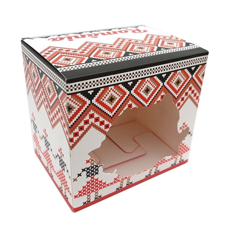Această cutie din carton este special concepută pentru ambalarea cănilor, având un design inspirat din motivele tradiționale românești. Modelul decorativ include personaje stilizate și elemente geometrice specifice portului popular, iar inscripția „România” adaugă un plus de autenticitate și valoare simbolică.