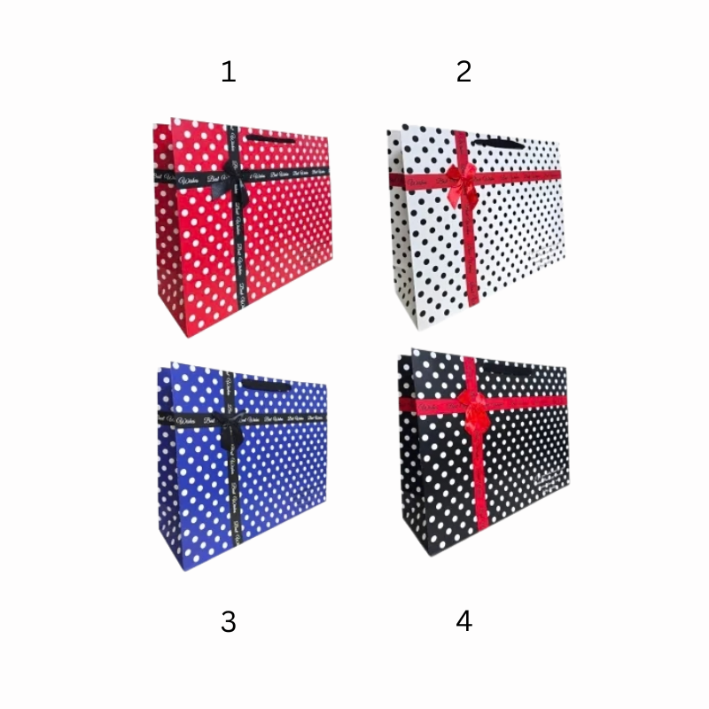 Pungă cadou elegantă din carton gros, decorată cu buline albe clasice și fundă satinată cu mesajul „Best Wishes”. Ideală pentru ambalarea cadourilor voluminoase, oferind un aspect festiv și rafinat.