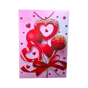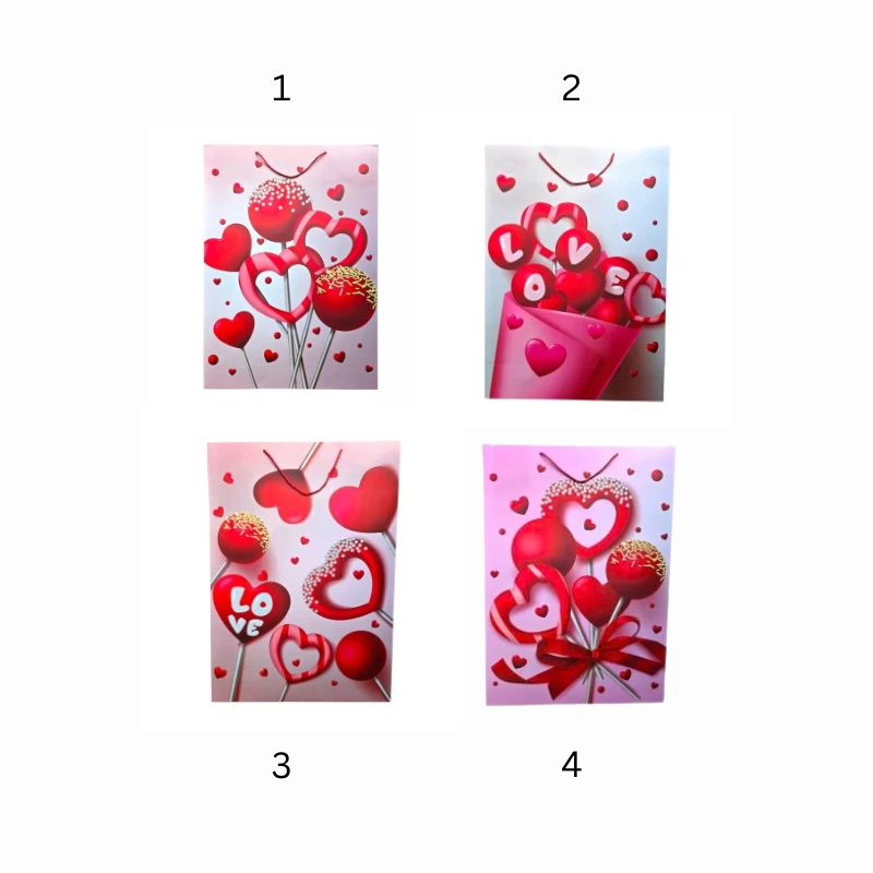 Designul este pus în valoare de motiv cu inimioare tridimensionale, baloane decorative și detalii dulci, în nuanțe de roșu, roz, alb și accente aurii sau perlate, oferind un aspect festiv și romantic. Punga este prevăzută cu mâner rezistent, potrivit pentru transport în siguranță, și este ideală atât pentru uz personal, cât și pentru magazine de cadouri sau evenimente tematice.