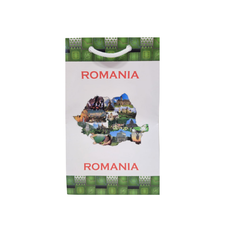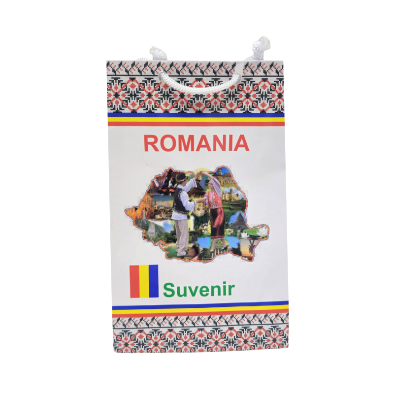 Punga cadou Romania 17.5 x 11 cm este decorată cu imagini reprezentative ale țării, precum harta României și motive tradiționale sau turistice. Culori vii și designul specific de suvenir o transformă într-o alegere inspirată pentru a ambala cadouri cu tematică românească. Mânerul din șnur oferă o prindere comodă, iar dimensiunea compactă este ideală pentru suveniruri mici și alte daruri simbolice. Este o pungă practică, decorativă și potrivită pentru a oferi un plus de autenticitate drept cadou.