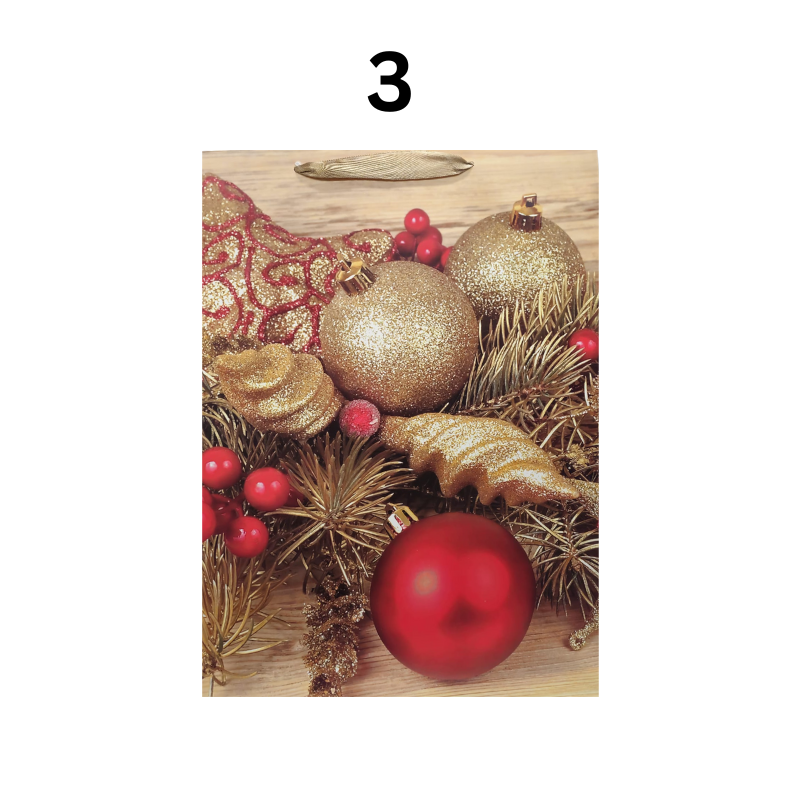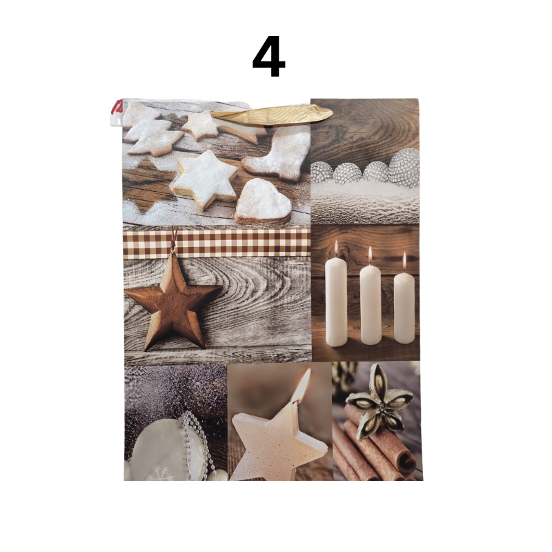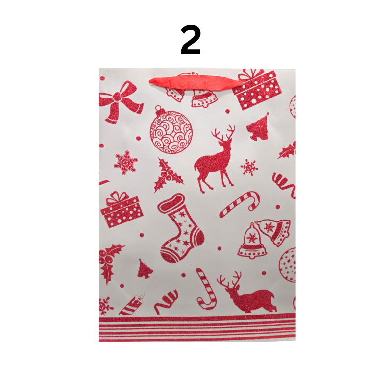 Această pungă cadou de Sărbători, realizată din carton lucios și rezistent, este decorată cu modele tematice de iarnă – brad, Moș Crăciun, ornamente, lumânări sau mesaje festive. Cu dimensiunile de 40x30 cm, este ideală pentru împachetarea cadourilor de dimensiuni medii spre mari. Fiecare model este prevăzut cu mâner din panglică și etichetă pentru un plus de eleganță. Este alegerea perfectă pentru a oferi daruri frumos prezentate celor dragi în perioada sărbătorilor de iarnă.