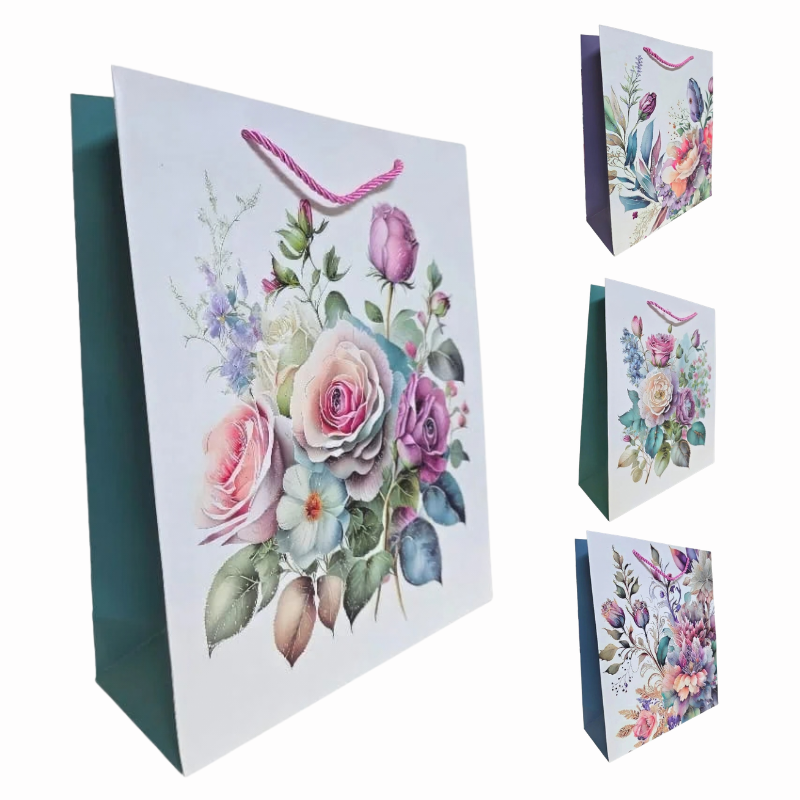 Pungile cadou Karmiseé L, cu dimensiunea de 42x31x12cm, sunt decorate cu imprimeuri florale elegante în nuanțe pastel și vii. Realizate din carton gros de calitate superioară, cu mâner textil rezistent, sunt ideale pentru a oferi cadourilor într-un mod rafinat.
