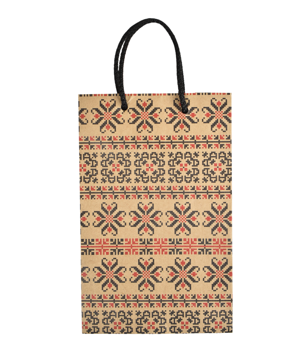 Tradiție și rafinament în ambalaj: Pungă de hârtie cu motiv tradițional, inspirată din elementele culturale autentice. Ideală pentru a ambala cadouri sau produse cu o notă de autenticitate. Alege punga de hârtie cu motiv tradițional pentru a adăuga o notă de eleganță și farmec în prezentările tale.