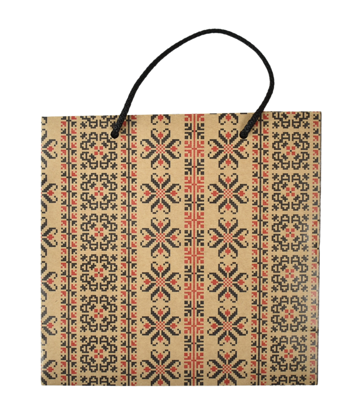 Tradiție și rafinament în ambalaj: Pungă de hârtie cu motiv tradițional, inspirată din elementele culturale autentice. Ideală pentru a ambala cadouri sau produse cu o notă de autenticitate. Alege punga de hârtie cu motiv tradițional pentru a adăuga o notă de eleganță și farmec în prezentările tale.