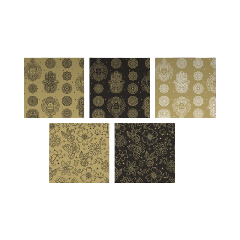 O hârtie de ambalat elegantă, în nuanțe de negru și auriu, perfectă pentru cadouri deosebite. Modelele florale și simbolurile decorative îi oferă un aer rafinat și sofisticat. Este rezistentă și ușor de folosit pentru împachetări impecabile.