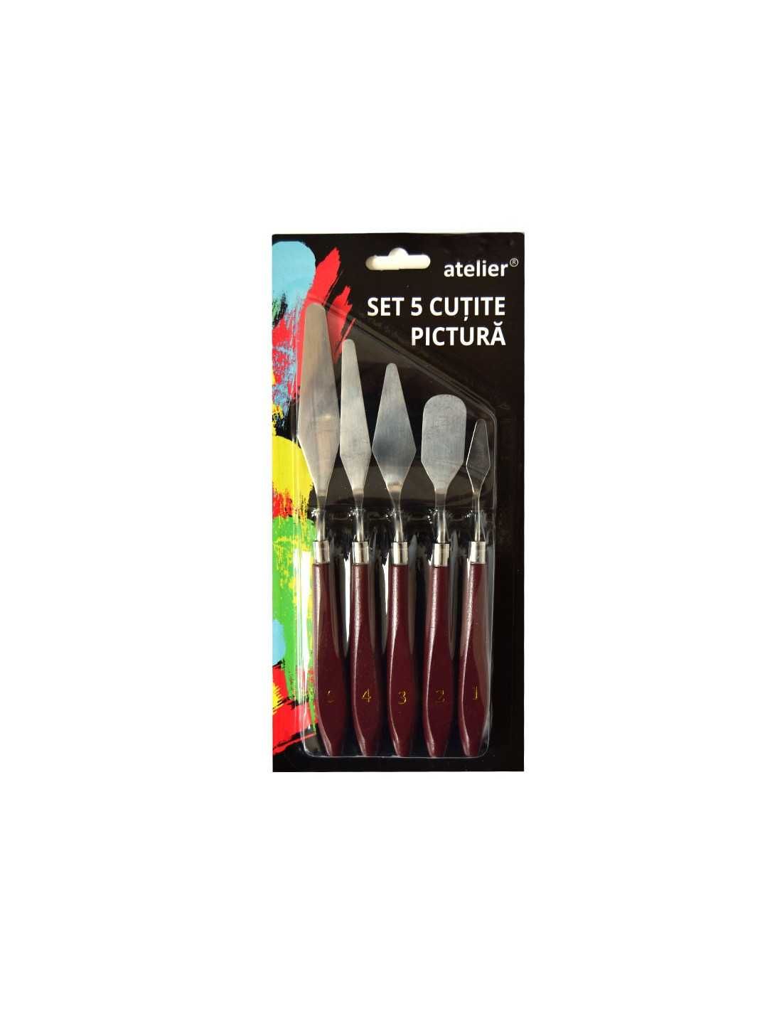 Setul de 5 cutite pentru pictura metal Atelier este ideal pentru tehnica de pictura in cutit sau amestecarea culorilor pe paleta de pictura. Cu lamele de metal durabil, acest set este perfect pentru artistii care doresc sa creeze lucrari de arta deosebite.