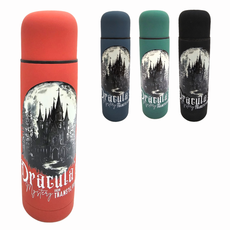 Acest termos se remarca prin grafica sa detaliata ce infatiseaza un castel enigmatic sub lumina lunii pline, evocand atmosfera fascinanta a povestilor cu Dracula. Disponibil intr-o gama de culori saturate — rosu intens, albastru inchis, verde smarald si negru clasic — produsul este conceput sa reziste utilizarii zilnice, pastrandu-si aspectul vibrant datorita calitatii imprimarii.