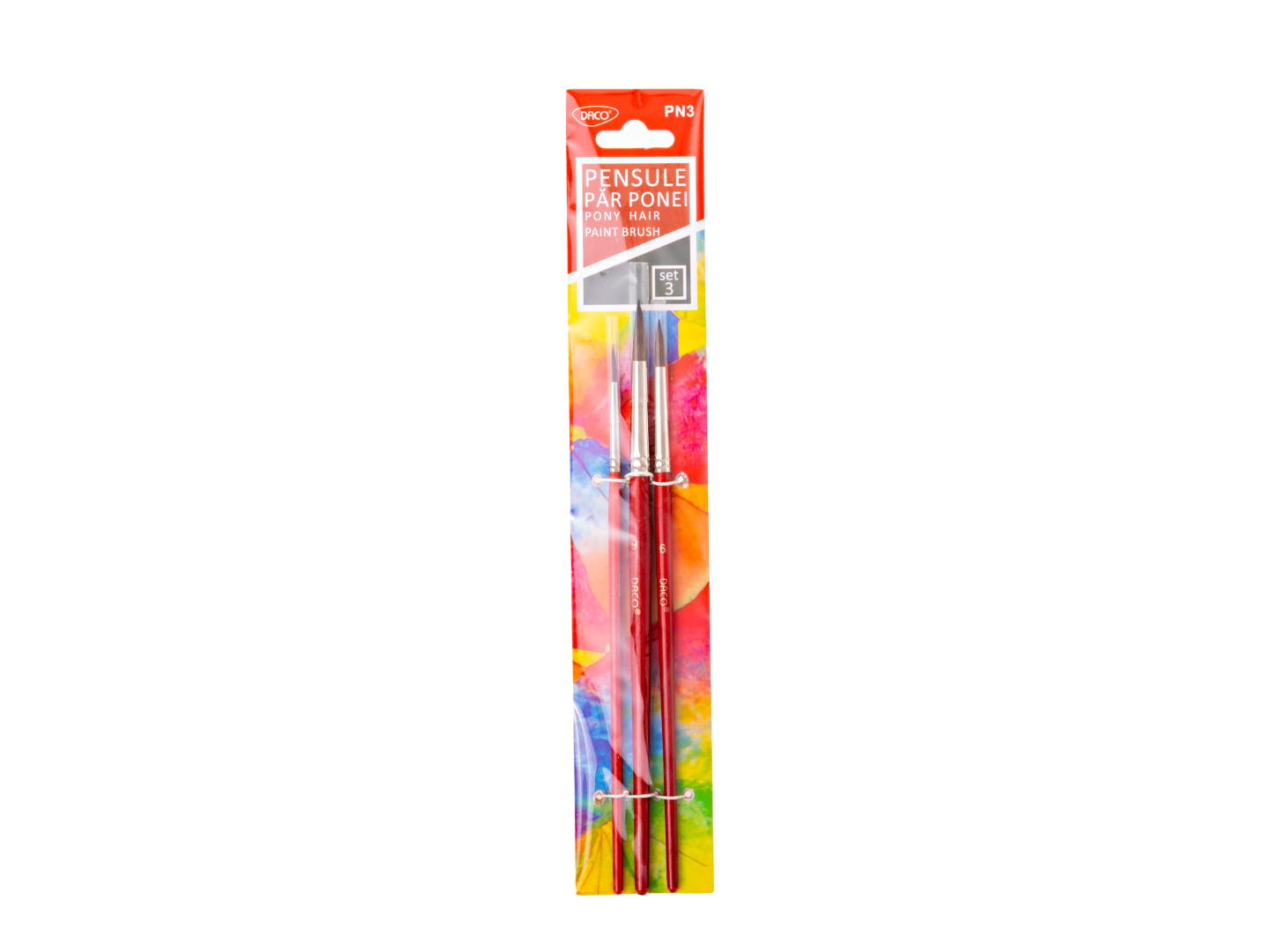 Setul de pensule din păr de ponei de la Daco este potrivit pentru activități artistice diverse, oferind o aplicare uniformă și controlată a culorii. Setul include 3 pensule în dimensiunile nr. 3, 6 și 9, fiind ideale pentru detalii, dar și pentru acoperirea unor suprafețe mai mari.