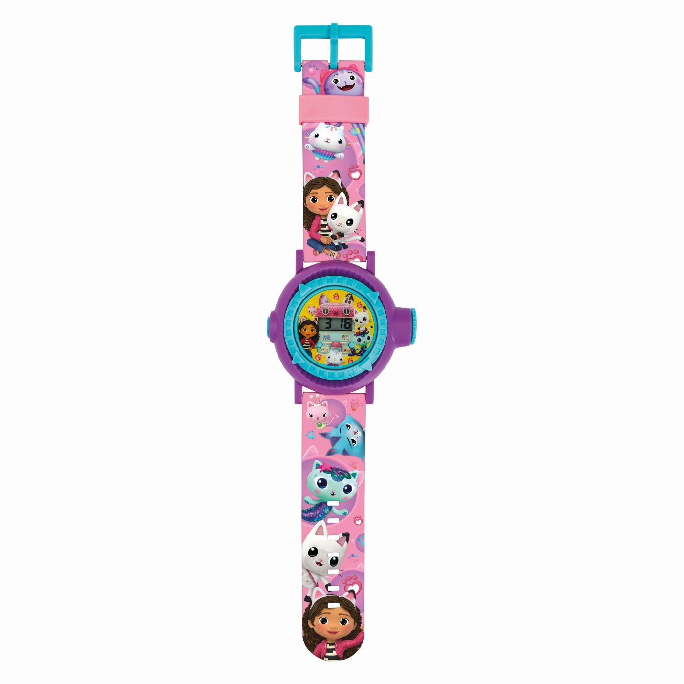 Intra in lumea magica Gabby’s Dollhouse cu ceasul digital cu proiector! Acest accesoriu adorabil nu doar ca afiseaza ora, dar proiecteaza si 10 imagini colorate cu personajele preferate din indragitul serial Netflix. Cureaua este decorata cu motive vesele si culori atractive, perfecte pentru copii. Usor de purtat si plin de surprize, ceasul transforma fiecare moment intr o aventura. Recomandat copiilor de peste 3 ani, acest ceas digital cu proiector este cadoul ideal pentru micii fani Gabby’s Dollhouse.