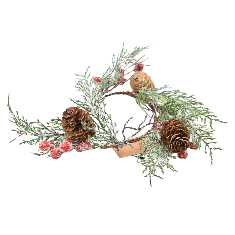 Decorată cu crenguțe realiste de tuia, conuri naturale și bobițe roșii înghețate, această coroniță oferă un aspect natural și elegant, specific sezonului de iarnă.