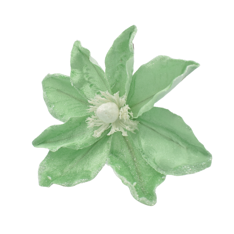 O magnolie decorativă delicată, realizată din catifea în nuanță verde mentă, perfectă pentru a aduce prospețime și eleganță decorului tău de sărbători. Textura fină și accentele discrete de sclipici îi oferă un aspect rafinat, ideal pentru brad, coronițe sau aranjamente festive.