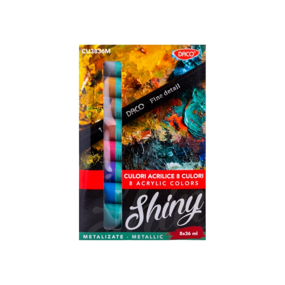 Descoperă magia culorilor acrilice metalizate de la DACO și adaugă un plus de eleganță și profunzime fiecărei lucrări. Setul conține 8 culori metalizate, fiecare tub având 36 ml, oferindu-ți sau pale variată pentru a crea spectaculoase și accente strălucitoare.