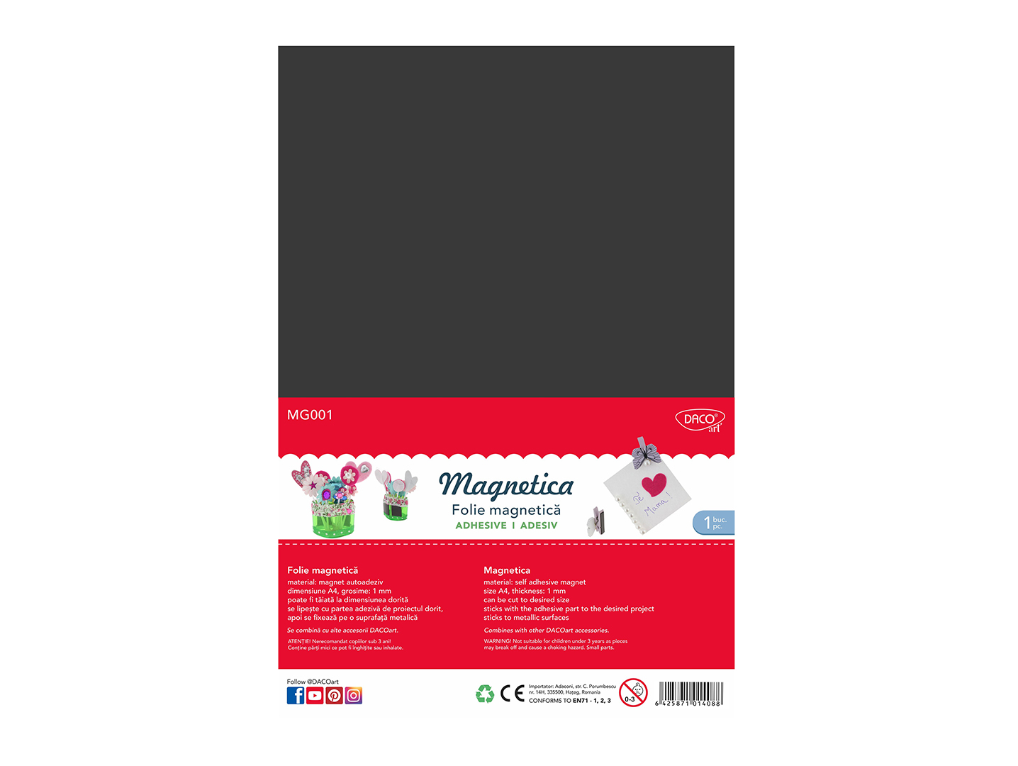 Transformă ideile tale în obiecte magnetice unice cu folia magnetică autoadezivă A4 negru DACOart. Este realizată din material flexibil, cu grosime de 1 mm, ușor de decupat și adaptat în funcție de nevoile tale. Se aplică rapid datorită stratului autoadeziv și se fixează pe orice suprafață metalică, fiind soluția ideală pentru a crea etichete personalizate, afișe sau decorațiuni originale. Perfectă pentru școală, birou sau proiecte DIY, această folie îți oferă libertate totală de exprimare și organizare.