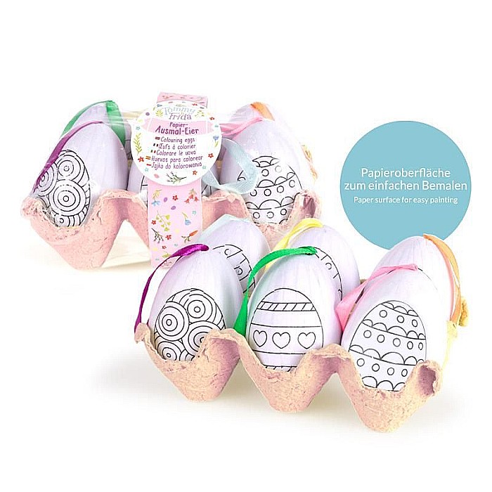 Conținut: 6 ouă de colorat diferite (aprox. 4,7 x 6,7 cm), inclusiv panglica de satin fixă și colorată pentru agățat. Lungime totală: 13,3 cm.