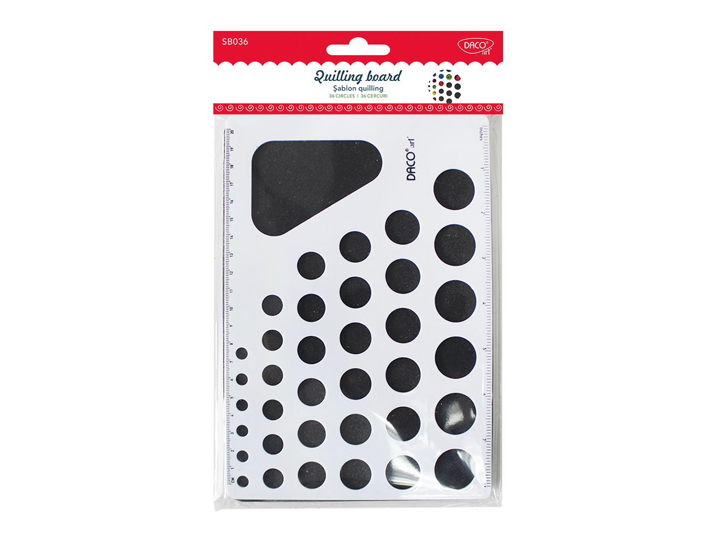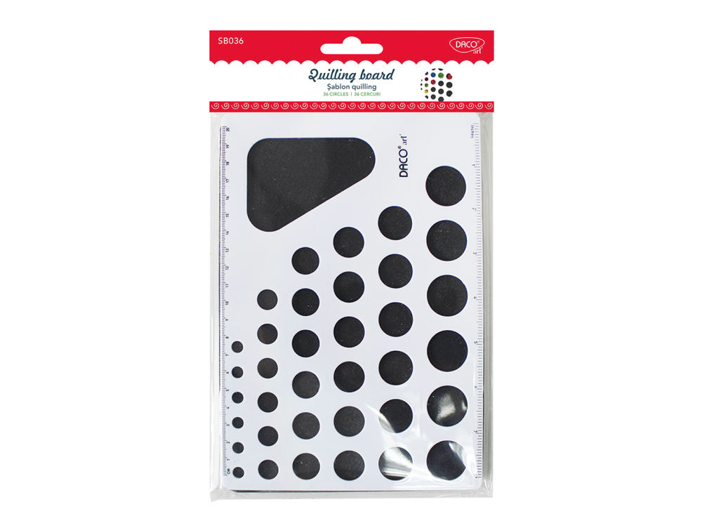 Șablonul quilling DACO cu 36 de cercuri este un instrument practic pentru realizarea formelor perfecte din hârtie. Cele 6 dimensiuni diferite permit crearea unor modele variate, cu rezultate uniforme. Baza din burete oferă stabilitate și confort în timpul lucrului.
