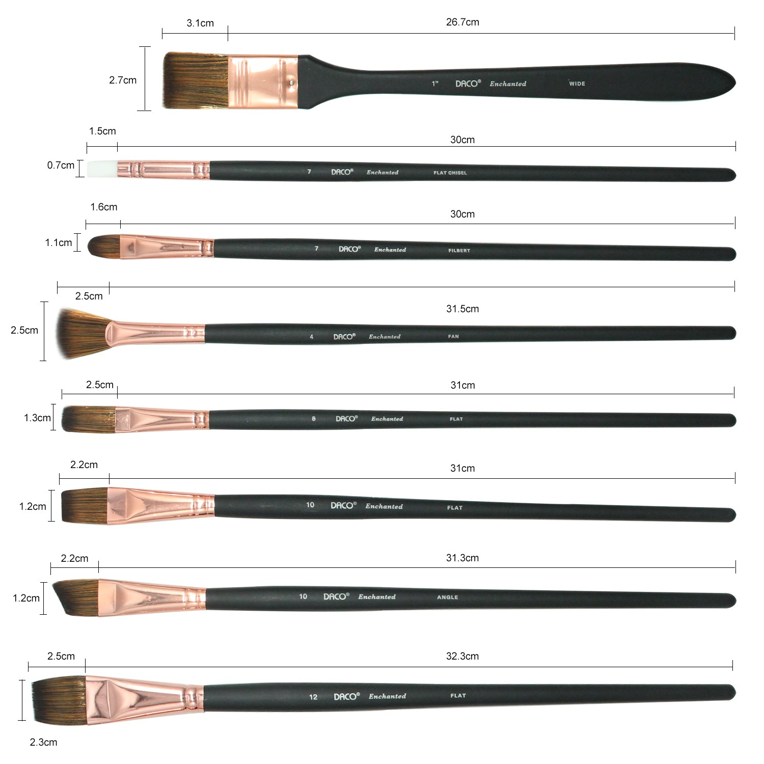 Setul 15+1 pensule Enchanted DACO oferă o gamă variată de pensule pentru lucrări precise și aplicări ample de culoare. Include bonus o pensulă de silicon și accesorii pentru protecție și depozitare. Ideal pentru pictură, artizanat și proiecte creative.