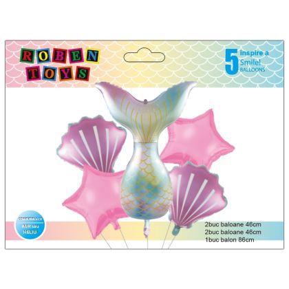 - Setul contine: 1 balon coada de sirena, 2 baloane roz, cu forma de stea, 2 baloane scoica si 1 pai.