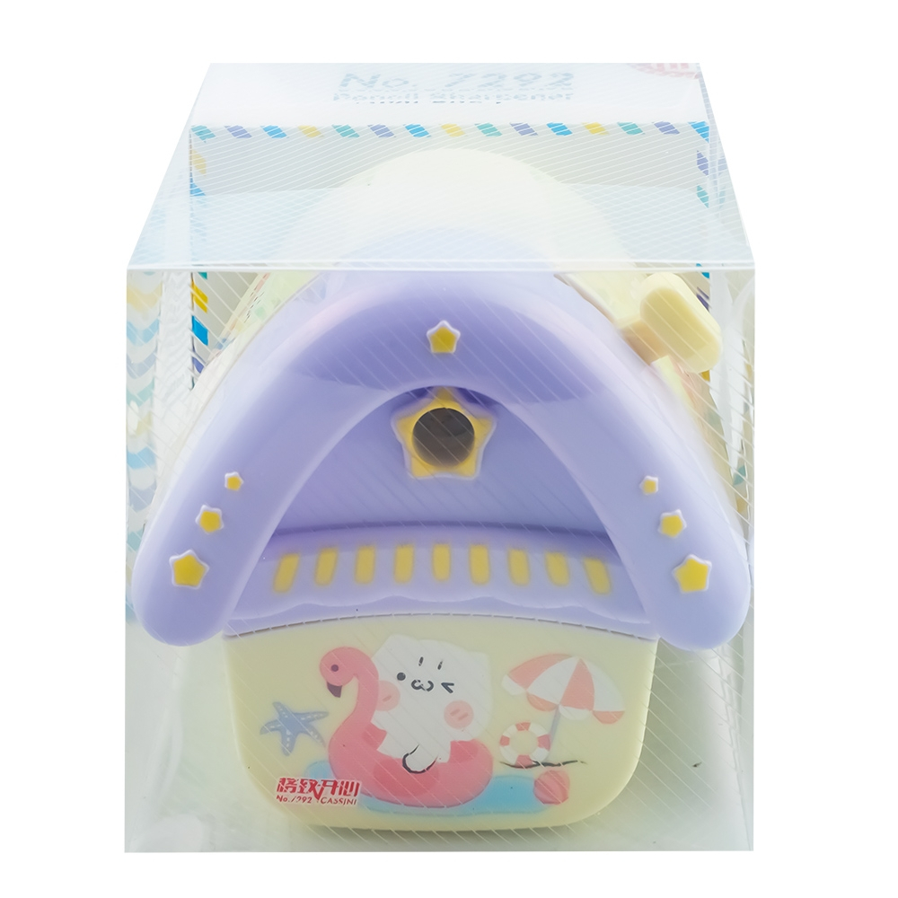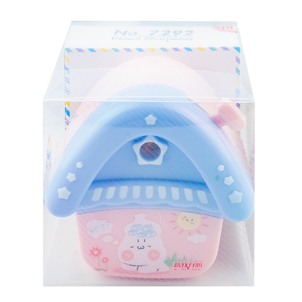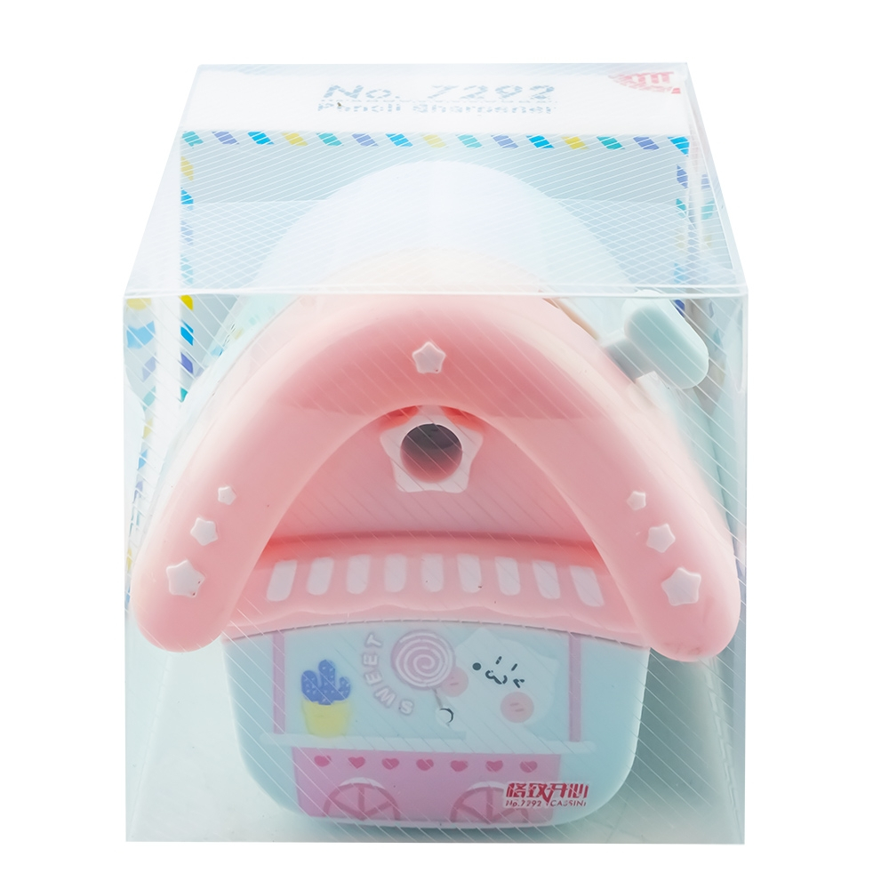 Ascuțitoare practică și atractivă, realizată sub forma unei căsuțe simpatice, ideală pentru utilizarea zilnică. Este prevăzută cu manivelă pentru ascuțire rapidă și sertar detașabil pentru reziduuri. Potrivită pentru creioane standard, în culori pastelate, plăcute pentru copii.