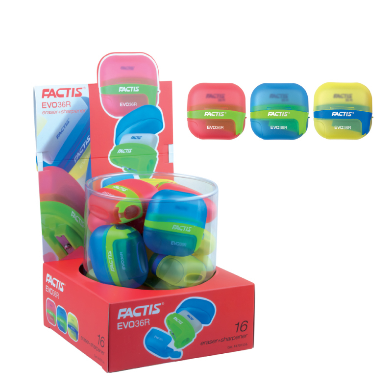 Alege ascuțitoarea cu radieră EVO36R Factis pentru un instrument 2 în 1, practic și eficient. Disponibilă în roșu, galben și albastru, este ideală pentru școală. Compactă și ușor de folosit, perfectă pentru penar.
