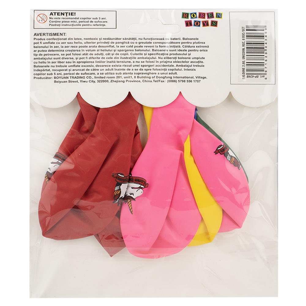 Setul de baloane Unicorn Roz 2.8 g conţin 8 baloane unicolore cu imprimeu cu unicorn, în culori variate, potrivite pentru decorarea petrecerilor şi evenimentelor tematice. Baloanele sunt confecționate din latex de calitate, non-toxic, și pot fi umflate cu aer sau heliu. După umflare, balonul se leagă cu o panglică neinclusă pentru a permite plutirea în aer. Produsul se livrează neumflat, având dimensiunea aproximativă de 7.5x13.5 cm în stare neumflată. La temperaturi scăzute baloanele pot micora volumul, iar căldura extremă poate determina creșterea volumului heliului și spargerea acestora, de aceea este recomandat să nu fie umflate excesiv și să nu fie expuse direct la soare. Nu se recomandă eliberarea baloanelor umplute cu heliu în aer liber sau în apropierea liniilor de înaltă tensiune și nu trebuie să încerce în preajma obiectelor ascuțite. Sunt potrivite pentru decor, distracție și pot avea și efect antistres, fiind recomandate pentru adulți și copii cu vârsta peste 5 ani. Produsul este ambalat în folie.