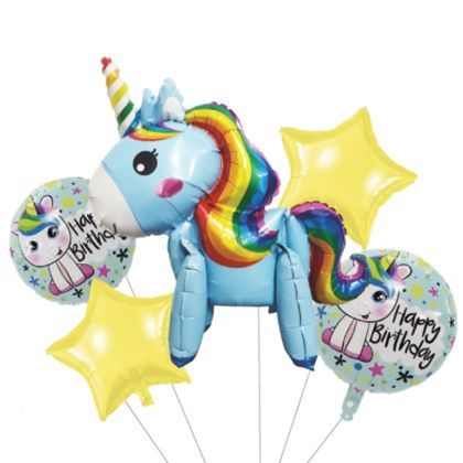 - Setul contine: 2 baloane galbene, cu forma de stea, 2 baloane inscriptionate "happy birthday", 1 balon cu forma de unicorn si 1 pai.