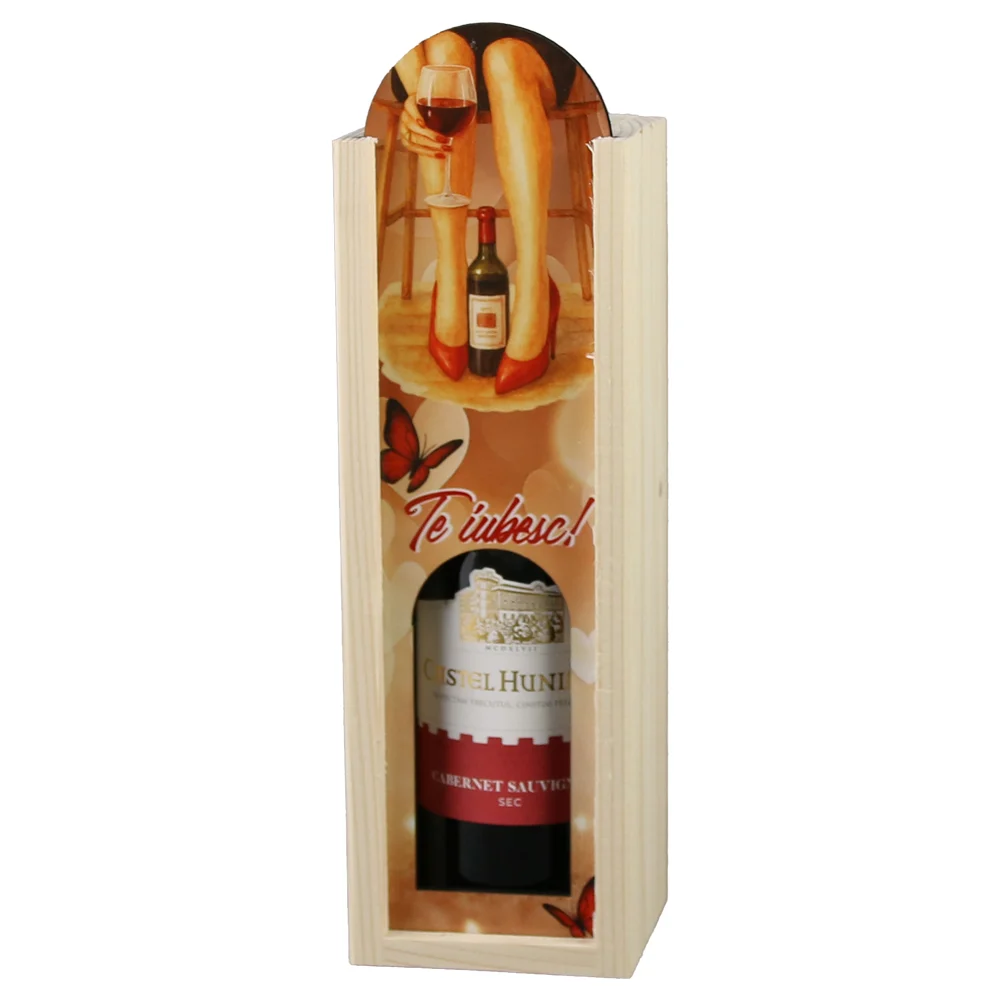Cutie din lemn natural cu sticlă de vin de 187 ml, decorată cu mesajul „Te iubesc!”, un cadou romantic și elegant, ideal pentru surprize speciale, potrivit pentru aniversări, Valentine’s Day sau momente în care vrei să transmiți un mesaj din suflet.