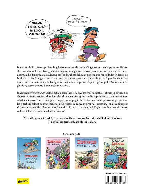 O bandă desenată clasică în care umorul inconfundabil al lui Rene Goscinny se îmbină perfect cu ilustrațiile pline de farmec semnate de Jean Tabary. Aventurile lui Iznogud continuă într-o poveste savuroasă, plină de magie, planuri absurde și răsturnări de situație. Un volum ideal pentru cititorii care iubesc benzile desenate pline de ironie și imaginație.