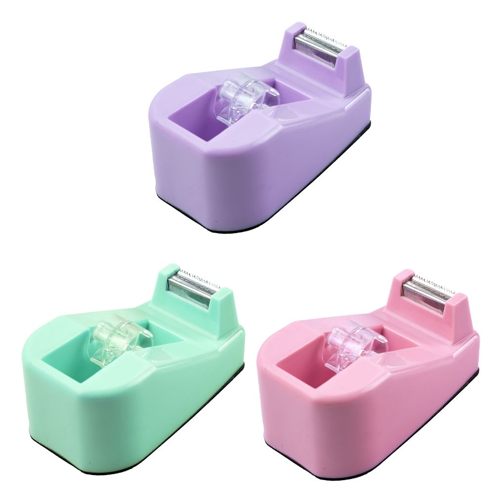 - Dispenserul este realizat din plastic, fiind disponibil in culori pastel: mov, roz sau turcoaz. Livrarea se face in functie de culoarea aleasa in comanda si disponibilitatea in stoc sau, daca nu este specificata culoarea in comanda, livrarea se face aleatoriu. Suportul benzii este fabricat din plastic transparent.