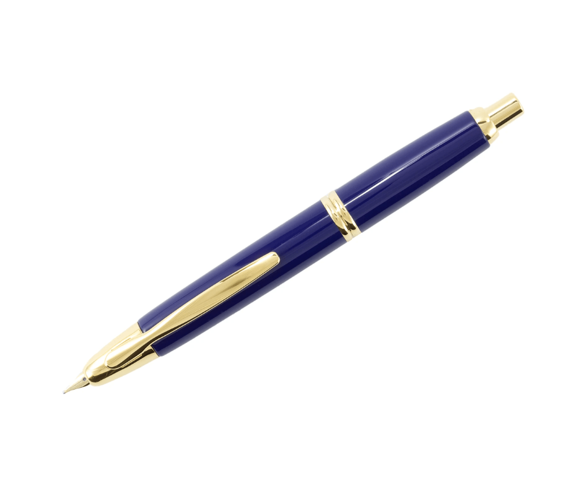 Stiloul Pilot Capless Gold este confectionat dintr-un corp metalic, albastru stralucitor, cu accente aurii.