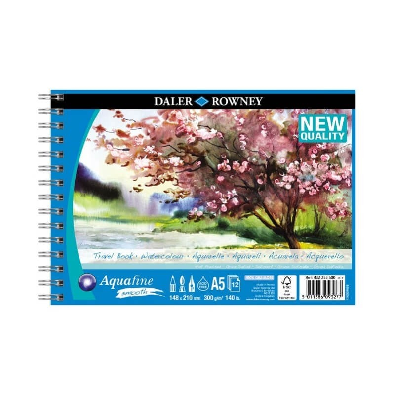 Blocul de hârtie acuarelă Aquafine Daler Rowney este un bloc de desen de calitate superioară, conceput special pentru pictura în acuarelă. Este realizat sub formă de travelbook cu spirală, fiind ușor de transportat în geantă și ideal pentru pictură în călătorii. Hârtia albă este fabricată din 100% pastă de lemn, nu conține acid și este tratată cu carbonat de calciu pentru a preveni deteriorarea culorilor în timp, produsă pe mașină Fourdrinier. Blocul conține 12 foi cu gramaj de 300 g/mp, oferind o bună absorbție a apei și o stabilitate ridicată, fără deformare. Este potrivit pentru tehnici de acuarelă precum wet-on-wet și este recomandat studenților, artiștilor profesioniști și pasionaților de pictură în acuarelă.