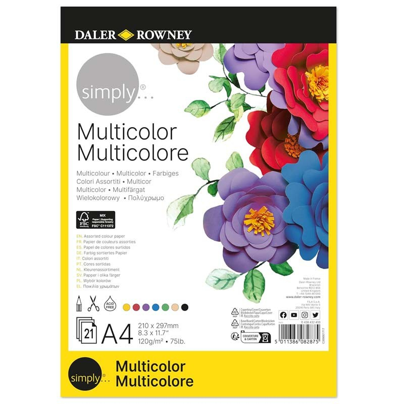 Blocul de hârtie multicolor Simply Daler Rowney este conceput pentru a răspunde unei game largi de activități creative, fiind potrivit pentru desen, colaj, scrapbooking, realizarea de felicitări sau proiecte educaționale. Hârtia are un gramaj de 120 g/mp, oferind un echilibru bun între flexibilitate și rezistență, astfel încât să poată fi folosită cu creioane colorate, markere, lipici sau foarfecă, fără a se deteriora.