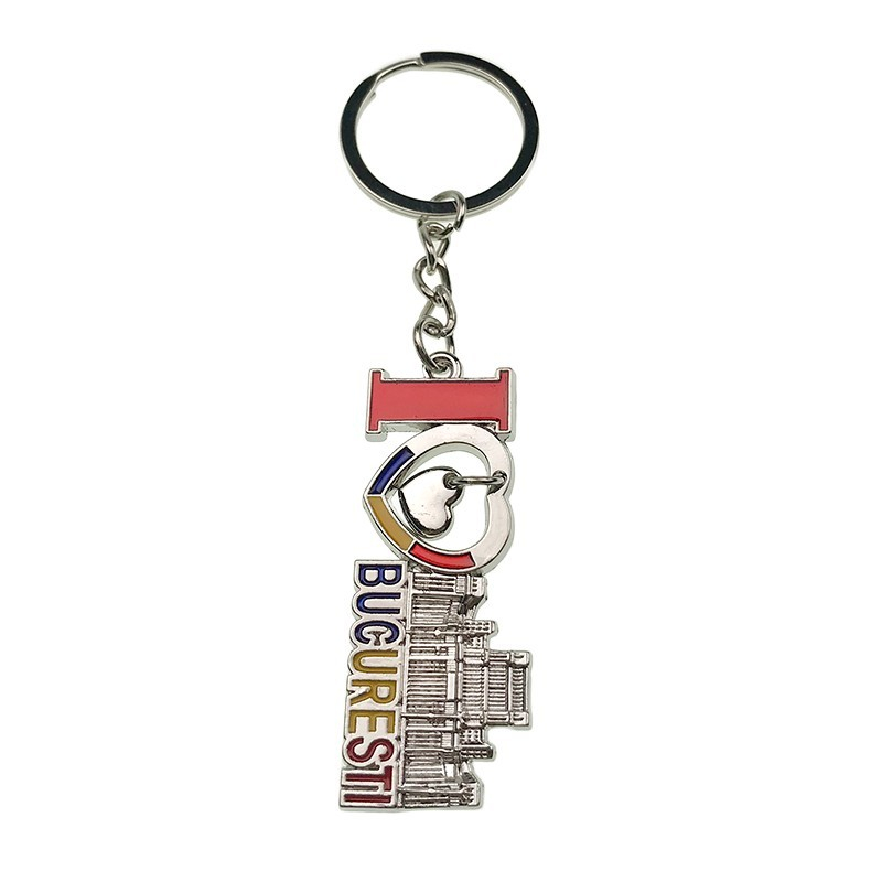 Inscripția București este redată vertical, fiind completată de un detaliu arhitectural stilizat, inspirat de clădirile emblematice ale capitalei. Brelocul este prevăzut cu lanț metalic și inel solid pentru prindere sigură, fiind practic pentru utilizare zilnică. Este o alegere potrivită atât ca suvenir turistic, cât și ca mic cadou simbolic pentru cei care iubesc Bucureștiul sau doresc să păstreze o amintire din România.