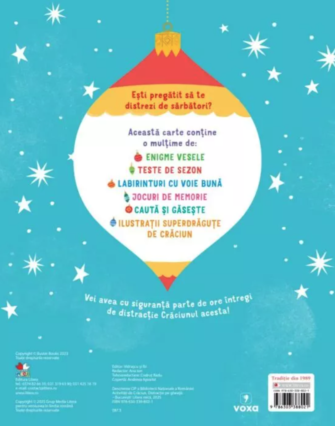 Această carte plină de jocuri și provocări aduce copiilor bucuria sărbătorilor într-un mod distractiv și interactiv. Cei mici vor descoperi enigme amuzante, labirinturi, jocuri de memorie și activități de tip caută-și-găsește, toate decorate cu ilustrații adorabile de Crăciun. Este alegerea perfectă pentru ore întregi de veselie în perioada iernii.