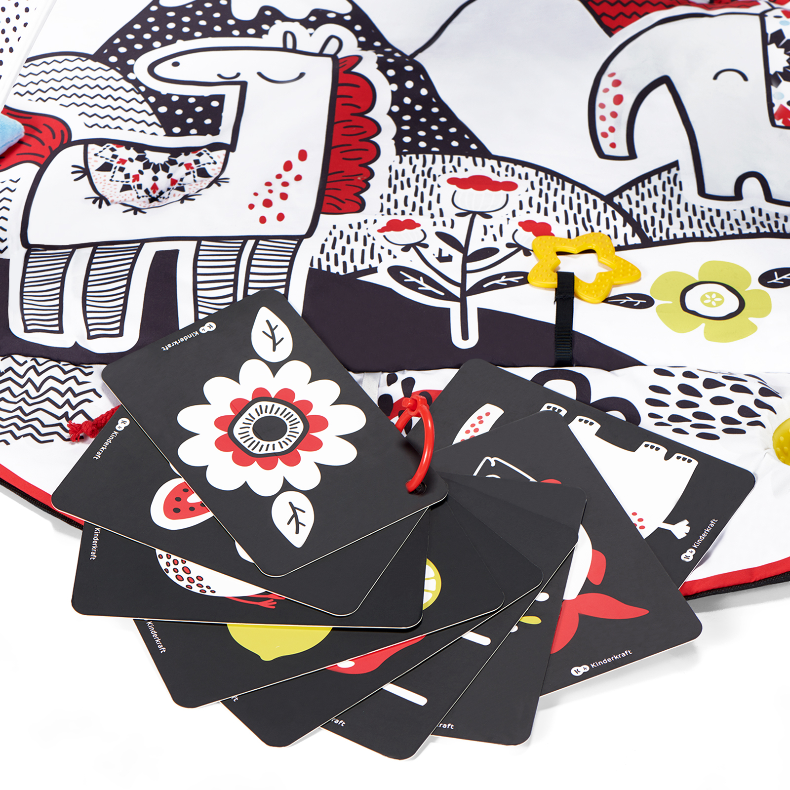 Covoras interactiv Kinderkraft 4SMART MULTICOLOR Covorasul interactiv cu contrast cromatic Kinderkraft 4SMART, cu 4 zone de interactiune ce sprijina dezvoltarea copilului, este destinat copiilor din primele luni de viata. În primele luni de viata, copiii percep doar culorile contrastante. Pentru a stimula imaginatia celui mic si a-i sprijini dezvoltarea din primele luni, am creat covorasul Kinderkraft 4SMART in culori clare, contrastante. Kinderkraft 4SMART are 4 zone care dezvolta: vazul, atingerea, auzul si concentrarea. Zona 1 dezvolta vazul: este decorata in culori contrastante - negru, alb si rosu cu accente galbene. Are panglici colorate, care atrag atentia copilului si il ajuta sa deosebeasca culorile. Zona 2 dezvolta auzul: are elemente care fosnesc si zornaie, ce il obisnuiesc pe cel mic cu diverse sunete. Copilul este liber sa le stranga in mana si sa le atinga. Zona 3 dezvolta atingerea: aici se afla elemente tridimensionale cu diverse texturi, datorita carora copilul isi stimuleaza simtul tactic si descopera noi forme si texturi. Zona 4 ii ajuta pe cei mici sa isi dezvolte puterea de concentrare: covorasul are locuri speciale pentru introducerea cartonaselor contrastant colorate si oglinzii. Aceste elemente capteaza atentia copilului si il invata sa se concentreze asupra unei anumit activitati. Setul include 2 stalpi cu o agatatoare ce gliseaza, de care se pot atarna si muta dupa dorinta jucariile incluse: 12 cartonase educative Kinderkraft 4SMART, o oglinda suspendata, minge de atarnat care zornaie, jucarie de atarnat care fasaie, minge senzoriala, jucarie de plus, panglici colorate, bile zornaitoare si oglinda, care se pot introduce in spatele foliei. Cartonasele se afla pe un inel – se pot atasa de carucior sau de ghiozdan, de exemplu. În plus, setul contine si o minge senzoriala. Este mare, are diferite culori, butoane si desene, datorita carora va atrage privirea copilului si ii va oferi multa bucurie. Imprimeul interesant, stilistica si multifunctionalitatea fac din el covorasul ideal pentru fiecare copil. Avantaje: Functionalitate: Covorasul a fost proiectat cu gandul la cei mai mici copii, care inca nu recunosc culorile si contrastele majore. De aceea, principalele culori ale covorasului sunt cele puternice: negru, alb si rosu cu accente galbene. Are 4 zone de dezvoltare: vaz: zona cu culori contrastante. Covorasul are panglici colorate si culori, care atrag privirea si atentia copilului, auz: elemente care fosnesc si zornaie, care atrag atentia copilului si obisnuiesc copilul cu diferite sunete, atingere: zona cu elemente tridimensionale (snururi si mingi) cu diverse texturi, astfel incat copilul sa le poate atinge si sa-si stimuleze simtul tactil, concentrare: covorasul are un loc special pentru a introduce cartonasele contrastante si oglinda. Setul include multe jucarii care stimuleaza simturile: 12 cartonase contrastante, oglinda suspendata, mingea de atarnat care zornaie, jucarie de atarnat care fasaie, minge senzoriala, jucarie de plus, panglici colorate, bile zornaitoare si oglinda, care se pot introduce in spatele foliei. Cartonasele se pot lua la plimbare – cartonasele Kinderkraft 4SMART au un carlig special cu care pot fi agatate, de exemplu, de carucior. Setul include si o minge senzoriala mare, care stimuleaza imaginatia copilului si ii aduce acestuia multa bucurie. Imprimeul interesant si stilistica il fac un covoras ideal pentru fiecare copil. Covorasul educativ Kinderkraft 4SMART este ideal pentru un cadou – este multifunctional, si in plus are si un ambalaj deosebit. În plus, este un cadou practic: dezvolta simturile copilului, ii stimuleaza imaginatia si ii va servi pentru mult timp. Confort: Covorasul are stalpi reglabilidotate cu o agatatoare care gliseaza usor, iar jucariile care atarna sunt usor de miscat si asezat oriunde. Covorasul este usor si simplu de impaturit (dupa desprinderea stalpilor). Îl poti lua cu tine in vacanta fara nicio problema! Murdaria nu va fi o problema – covorasul este foarte usor de curatat. Baza covorasului se poata spala manual, iar restul jucariilor sunt usor de curatat cu o carpa. Siguranta: Covorasul interactiv Kinderkraft 4SMART izoleaza bine fata de podea. Covorasul este potrivit pentru copii inca din primele zile de viata – indeplineste standardele EN 71-1, EN 71-2, EN 71-3 pentru jucarii si covorasele educative. Este realizat cu atentie – cusaturile puternice si lipsa elementelor proeminente, usor de desprins sporesc siguranta copilului. Constructie: Materiale: Covorasul: poliester Jucariile: poliester, plastic Cartonasele: hartie Dimensiuni: 128 cm x 116 cm, Înaltimea de la sol pana la stalpi 46,5 cm Dimensiunile covorasului cu marginile desfacute: 126 x 112 Dimensiunile covorasului cu marginile pliate: 75x75 Dimensiunile cartonaselor: 12x19 Greutate: 1,1 kg Dimensiunile ambalajului/greutate: 65 cm x 46 cm x 10 cm/1,6 kg