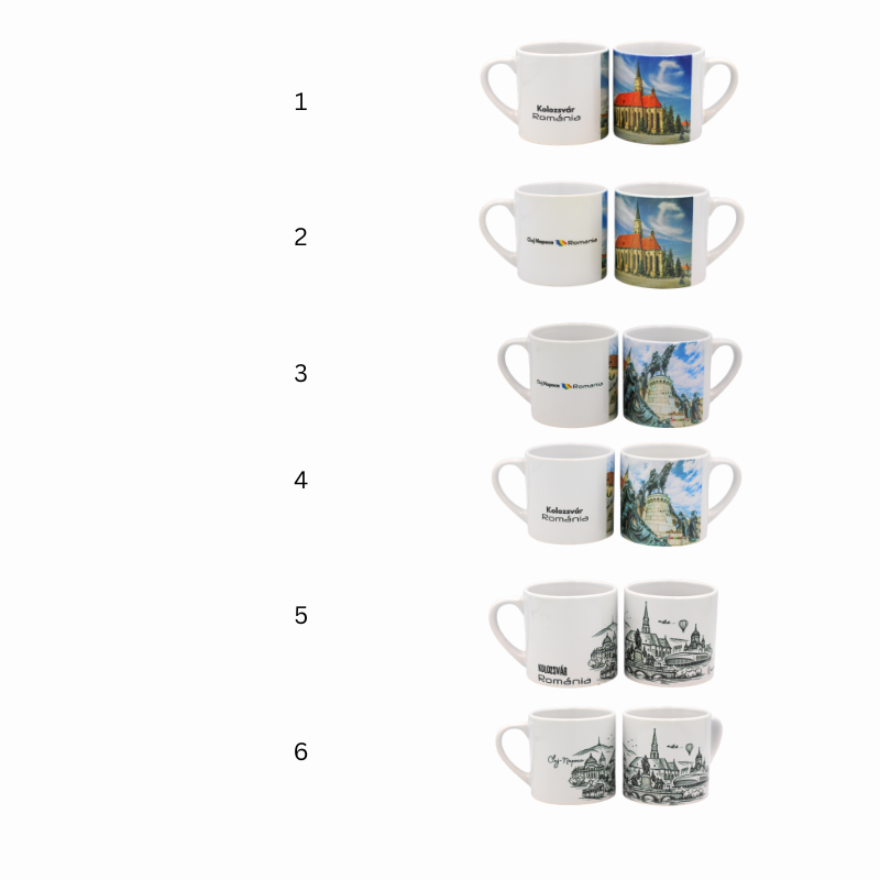 Poti alege aceasta cana mini personalizata ca suvenirul ideal dedicat orasului Cluj Napoca (Kolozsvar), avand la dispozitie diverse modele grafice care ilustreaza monumente emblematice si peisaje urbane reprezentative. Compacta si eleganta, cana iti este oferita in variante multiple, de la fotografii color de inalta calitate pana la ilustratii de tip schita, fiind perfecta pentru colectia ta sau pentru un cadou simbolic.