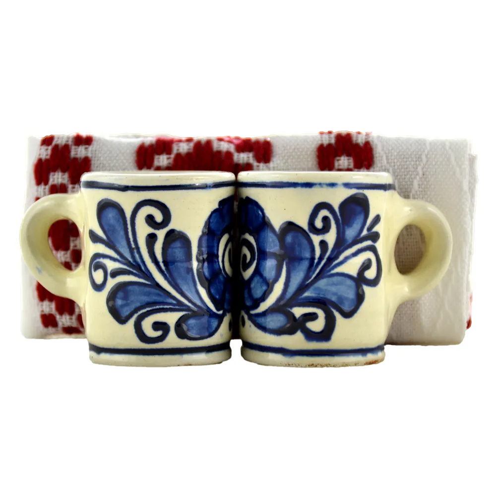 Acest set tradițional îmbină frumusețea artei populare cu utilitatea obiectelor de zi cu zi, fiind format dintr-un șervet țesut cu motive populare și franjuri decorative, alături de două căni ceramice pictate manual. Fiecare cană este realizată cu atenție la detalii, având modele inspirate din tradițiile românești, în culori vibrante care transmit căldură și autenticitate. Dimensiunile setului sunt de 12 x 7 x 7 cm, fiind ușor de integrat în orice decor sau de oferit drept cadou. Perfect pentru a adăuga un aer rustic în bucătărie, pentru colecționari sau ca suvenir plin de personalitate, acest set aduce un omagiu meșteșugurilor locale și frumuseții tradițiilor românești.