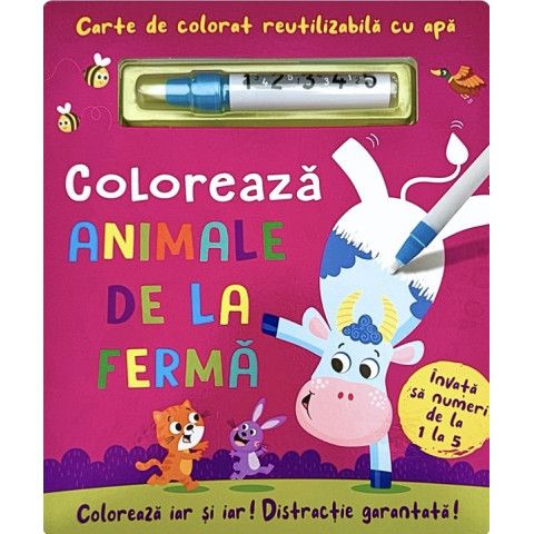 Coloreaza iar si iar! Distractie garantata! Invata sa numeri de la 1 la 5. Este foarte simplu: umpleti stiloul cu apa, apoi colorati paginile. La contactul cu apa imaginile ascunse vor aparea pentru a fi descoperite de cei mici. Dupa colorarea paginilor, in aproximativ 10 minute, acestea se usuca, revenind la imaginea alba initiala, apoi puteti sa o luati de la capat.