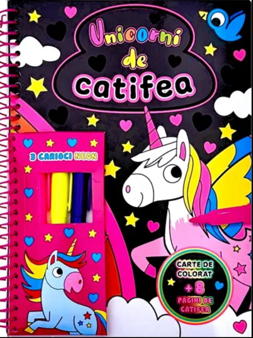 În plus, setul conține 3 carioci neon viu colorate, ideale pentru a evidenția detaliile fiecărui unicorn într-un mod spectaculos. Coperțile rigide protejează conținutul, iar designul în spirală permite o utilizare ușoară și confortabilă.