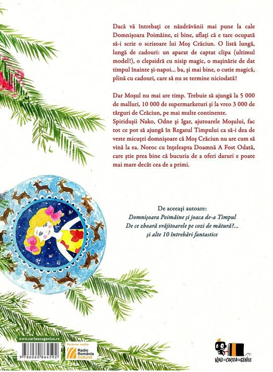Domnișoara Poimâine își dorește din tot sufletul ca Moș Crăciun să ajungă și în Regatul Timpului. O scrisoare plină de dorințe năstrușnice declanșează o cursă contra cronometru, cu spiriduși grăbiți și lecții neașteptate. O poveste caldă despre Crăciun, generozitate și bucuria de a dărui.