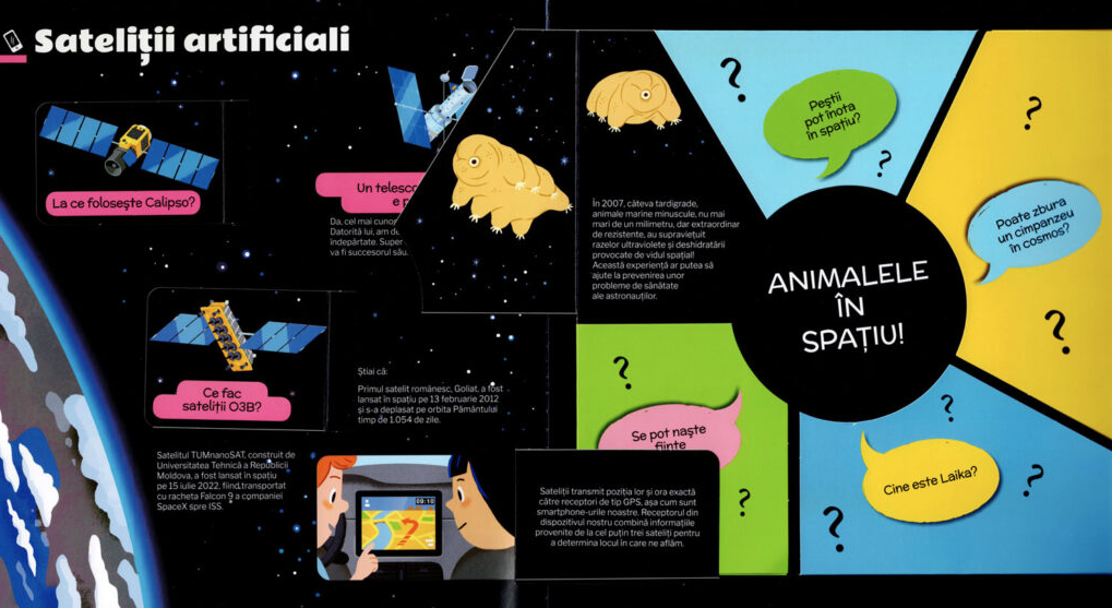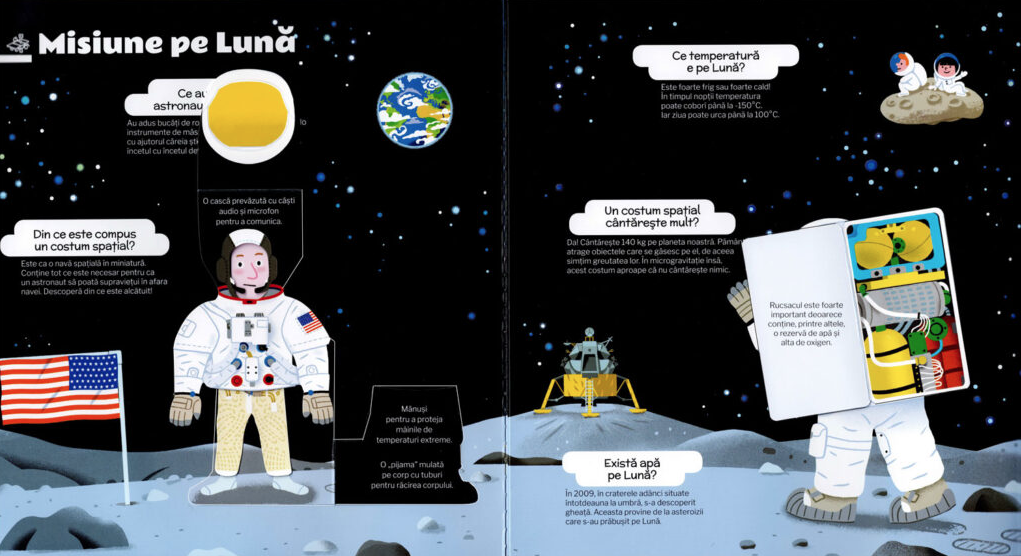 Ce îi așteaptă pe micii exploratori? Pagini cu elemente pop-up spectaculoase, clapete de ridicat, rotițe de învârtit și imagini glisante care prind viață la fiecare deschidere. Copiii pot asista la lansarea unei rachete în format pop-up, pot descoperi misterele Lunii pe o pagină triplă pliantă, pot compara cele opt planete ale Sistemului Solar, pot „asambla” o navă spațială și pot explora galaxii îndepărtate pe deschideri ample și impresionante. La final, un quiz interactiv le oferă ocazia să își testeze cunoștințele dobândite.