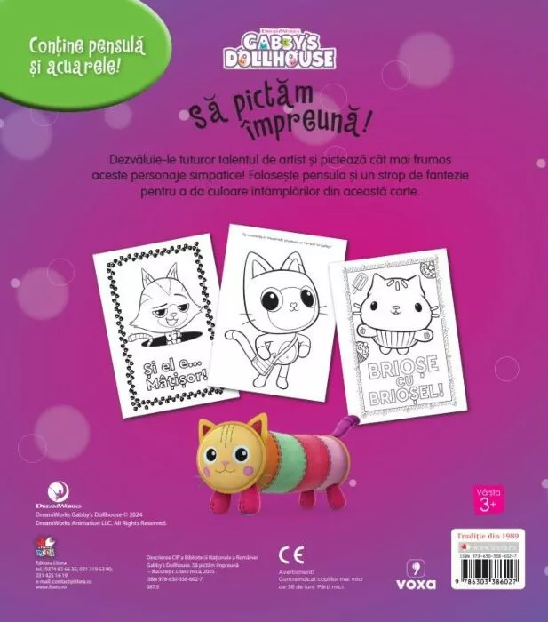 Gabbys Dollhouse Sa pictam impreuna îi invită pe copii să intre în lumea plină de culoare a personajelor din Gabby's Dollhouse și să își dezvăluie creativitatea prin pictură. Folosind pensula și puțină fantezie, cei mici pot da viață scenelor și personajelor simpatice din carte, transformând fiecare pagină într-o mică operă de artă. Activitățile sunt adaptate vârstei fragede și îi ajută pe copii să se bucure de desen și culoare într-un mod liber și plăcut.