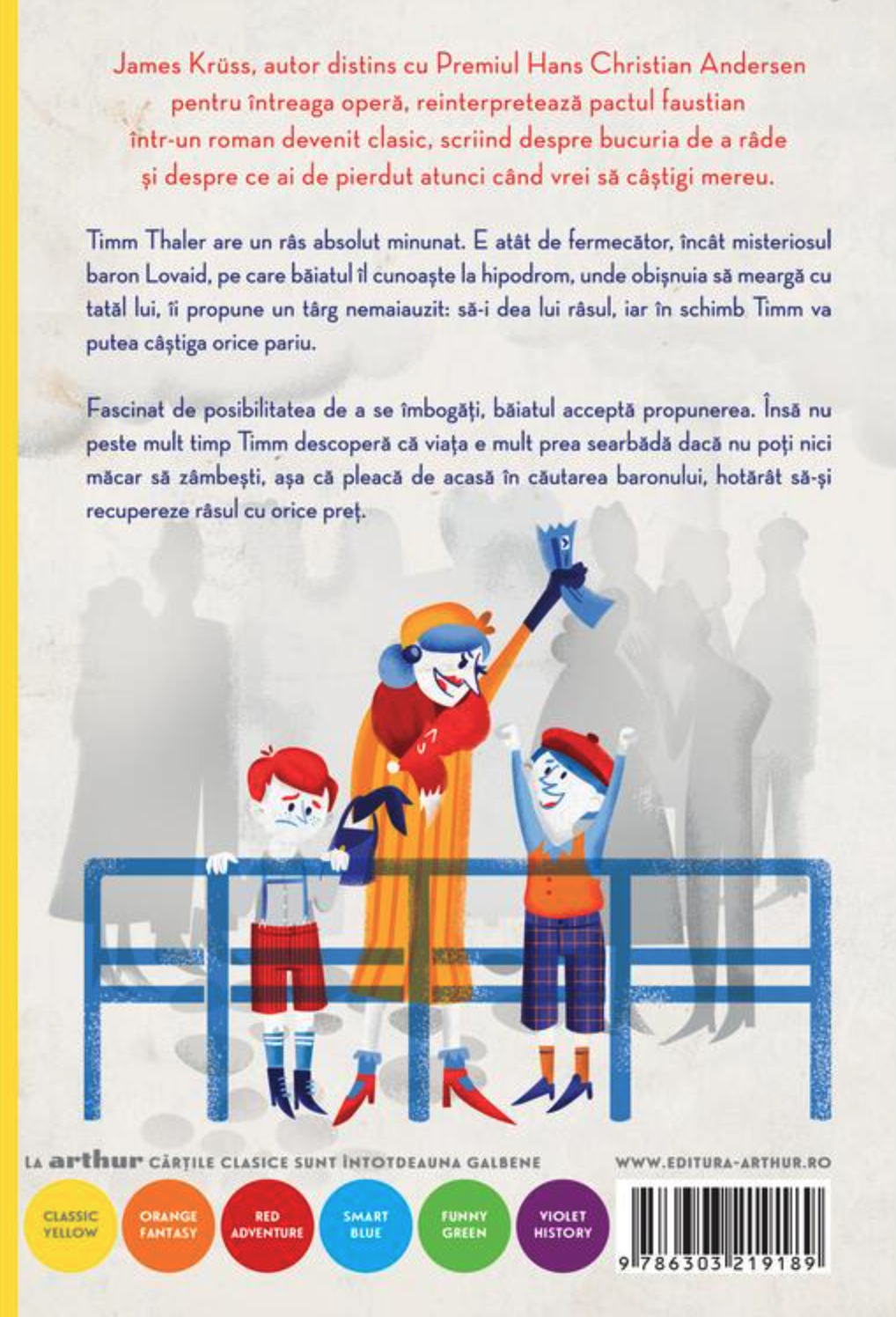 Editura Arthur readuce în atenția cititorilor unul dintre cele mai îndrăgite romane ale literaturii germane, Timm Thaler sau râsul vândut, o parabolă modernă despre inocență, tentație și forța de a rămâne tu însuți într-o lume în care totul pare de vânzare. James Krüss construiește o poveste cu farmec și profunzime, în centrul căreia se află Timm Thaler, un băiat vesel și generos, a cărui viață modestă este presărată cu visuri și speranțe.