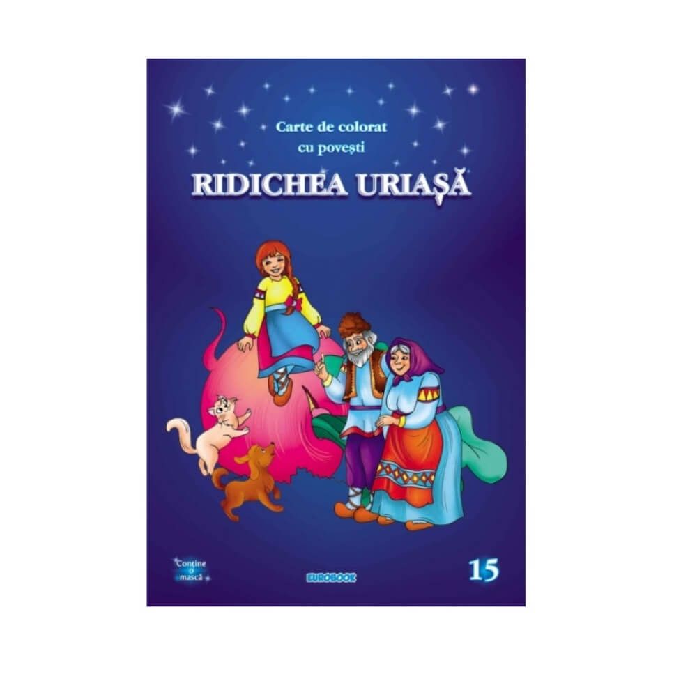 Carte de colorat cu povesti, cu desene clare, si text cu corp mare, cu pagini color oferite ca exemplu, pentru ca cei mici sa le poata citi, deslusi si colora. Datorita textului sau mare de tipar, cartea poate fi recomandata si pentru lecturat, atat pentru acasa, gradinita, cat si pentru scoala, la grupa pregatitoare. Pe coperta 3, cel mic gaseste in raport cu povestea, o masca surpriza pe care o poate confectiona, colora, apoi decupa.
