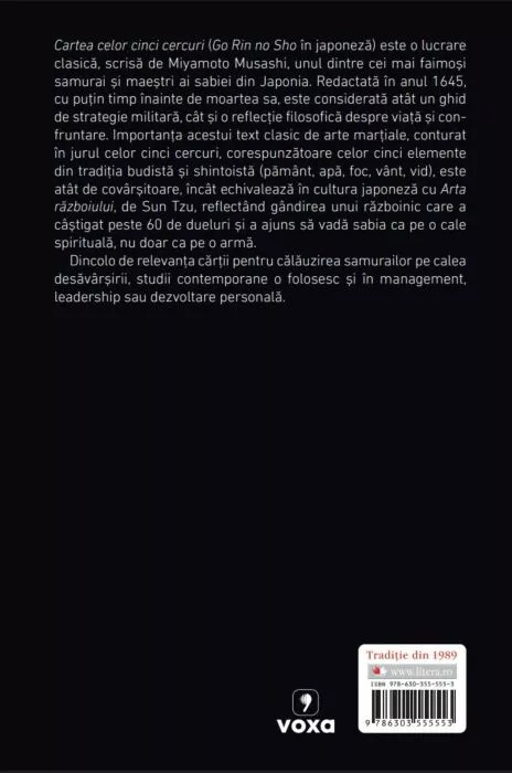 „Cartea celor cinci cercuri” (Go Rin no Sho) este opera definitorie a marelui samurai Miyamoto Musashi, maestru al sabiei și figură emblematică a istoriei japoneze. Scrisă în 1645, cu puțin timp înainte de finalul vieții sale, lucrarea reprezintă sinteza experienței acumulate de autor în peste 60 de dueluri câștigate și a reflecțiilor sale profunde asupra strategiei, disciplinei și autocontrolului.