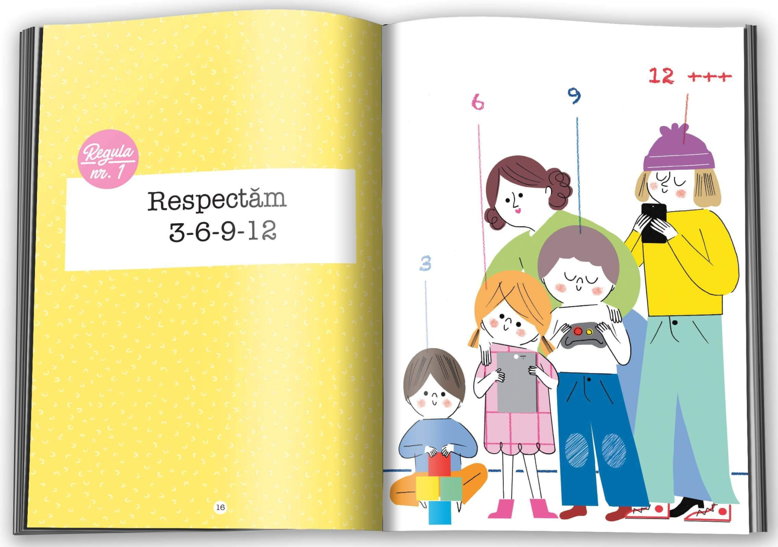 Ecrane – Bune practice explicate copiilor este un ghid pozitiv dedicat utilizarii constiente a ecranelor, adresat intregii familii. Cartea propune 15 reguli simple, fiecare insotita de ilustratii atractive pentru copii, explicatii teoretice si exemplu concret care ajuta la integrarea acestor obiceiuri in viata de zi cu zi. Materialul abordeaza intr-un mod accesibil provocarile aduse de prezenta tehnologie si ofera sfaturi pentru folosirea responsabila si echilibrata a dispozitivelor digitale. Coperta se desface intr-un poster cu toate regulile, util pentru afisarea vizibila in casa, astfel incat copiii si adultii sa poata reveni la recomandari ori de cate ori este nevoie. Ilustratiile sunt realizate de Sophie Bouxom, iar traducerea apartine Andrei Manole, cartea fiind parte din colectia Viata armonioasa impreuna.